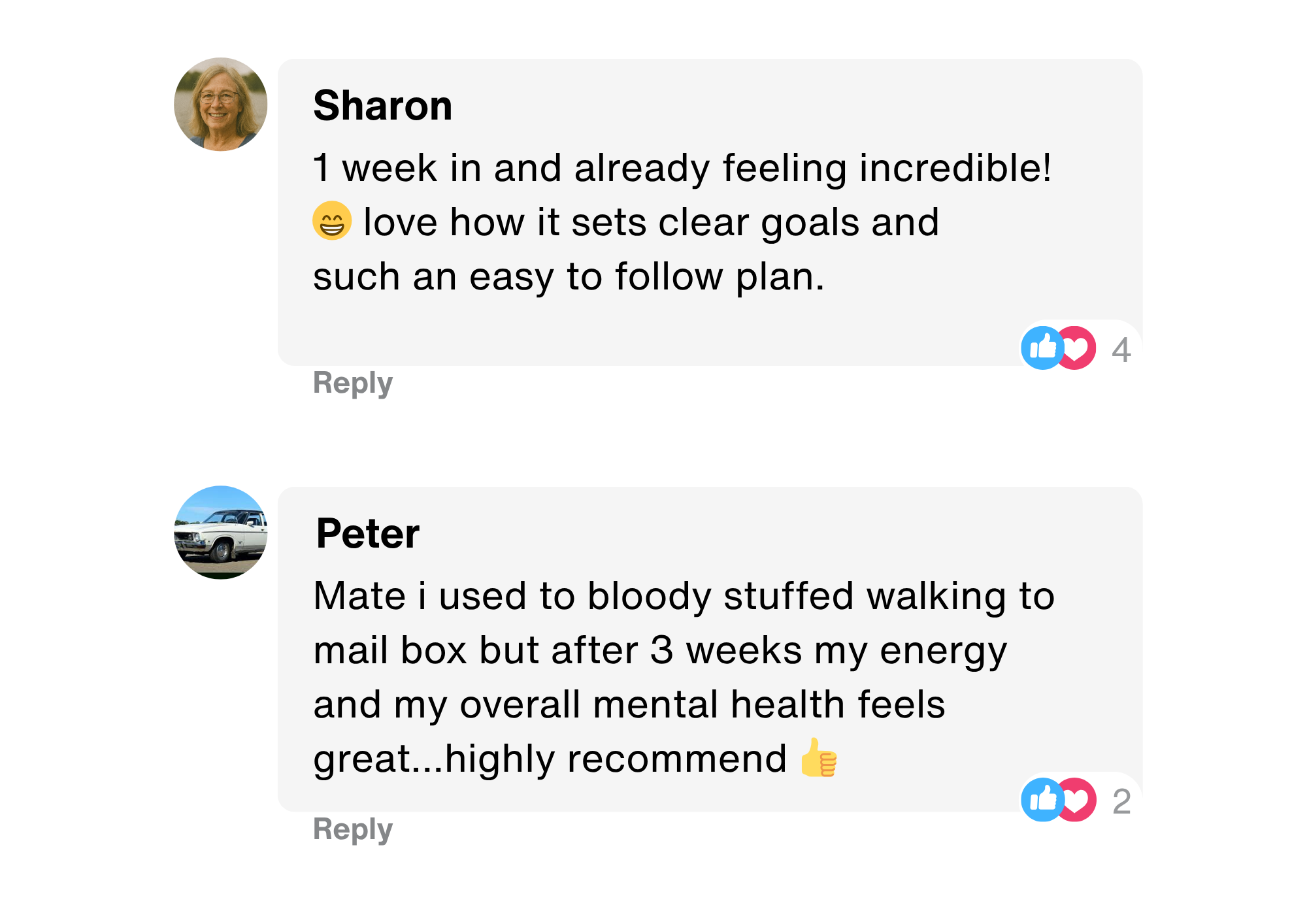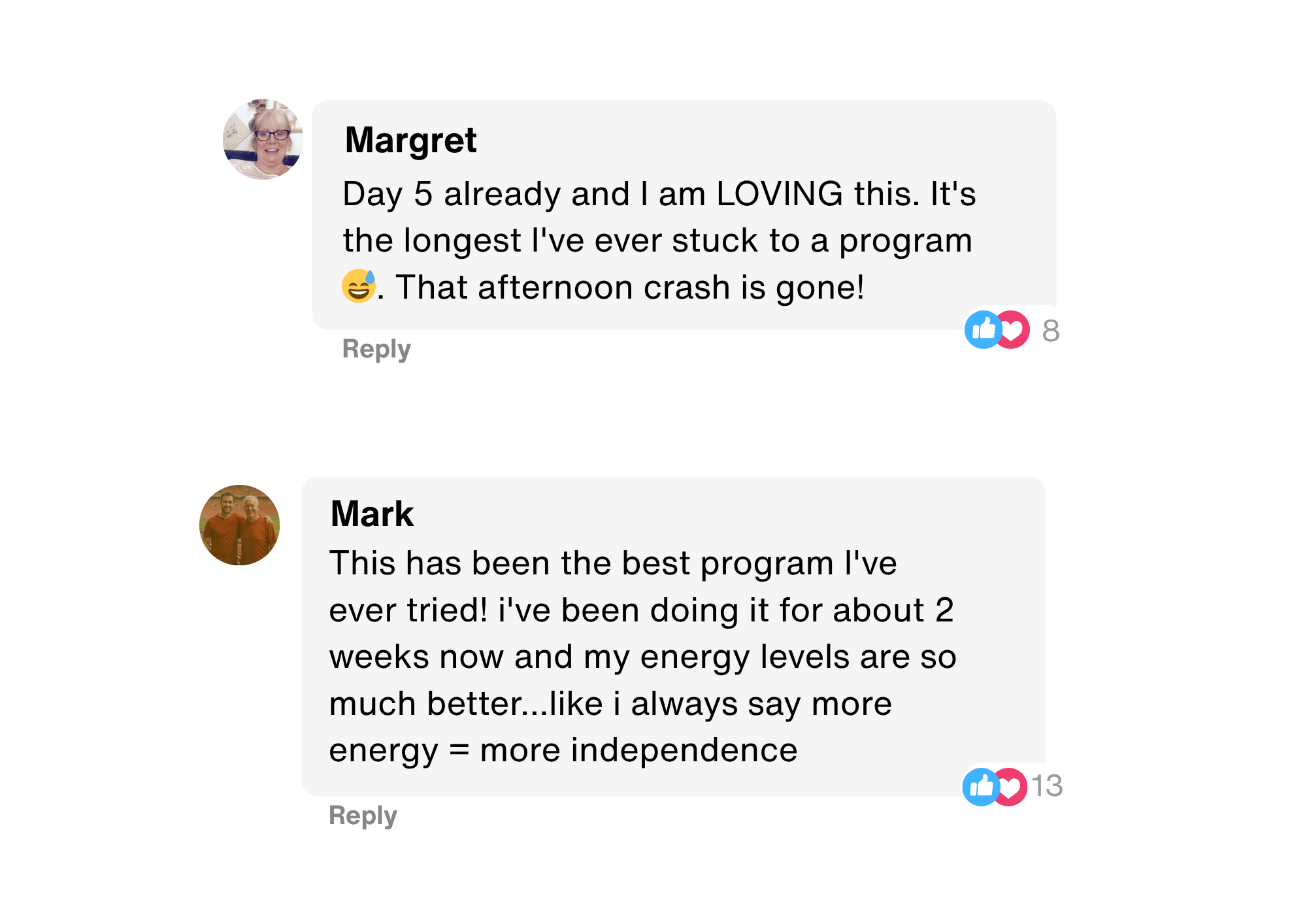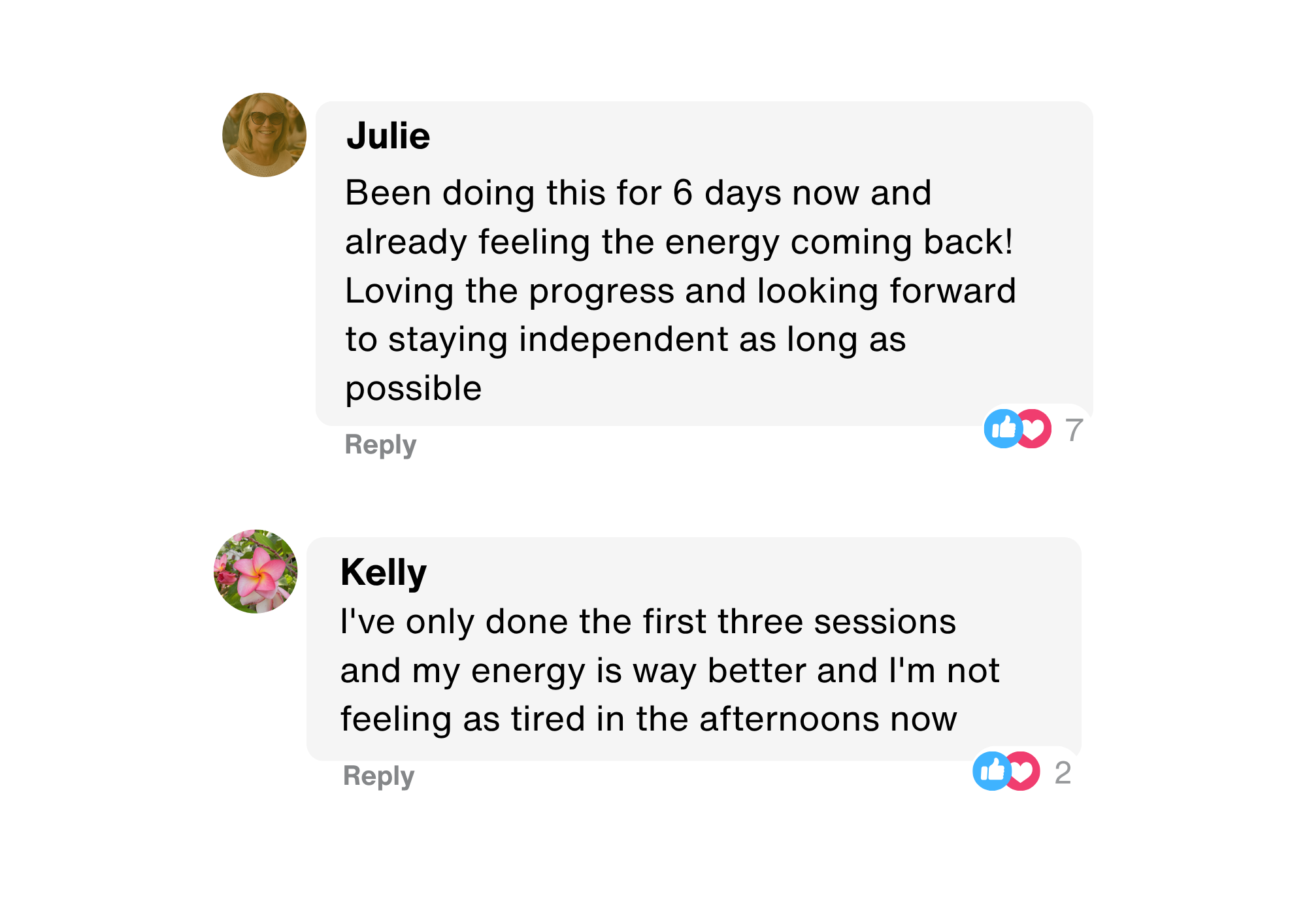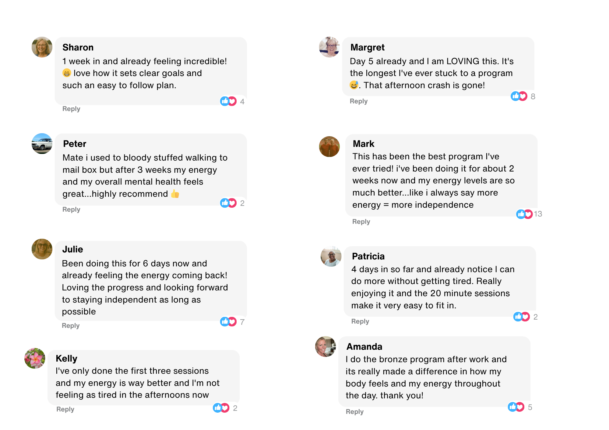 Join 100,000+ people over 50 who got their energy, strength and independence back with a personalised program that turns exhaustion into energy in days and stiffness into strength in weeks.